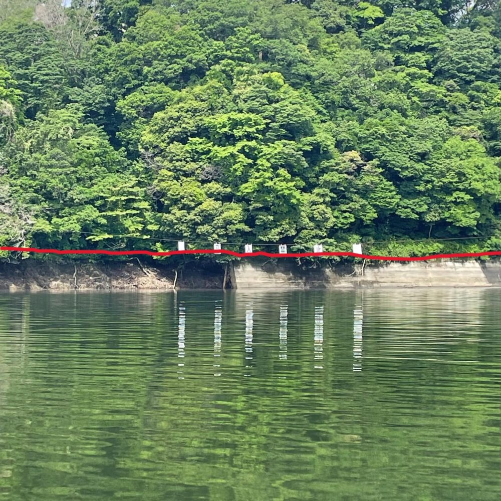 フル満水時は浸かっておりました(赤線の箇所)。目測で-4~5mくらいだと思います。